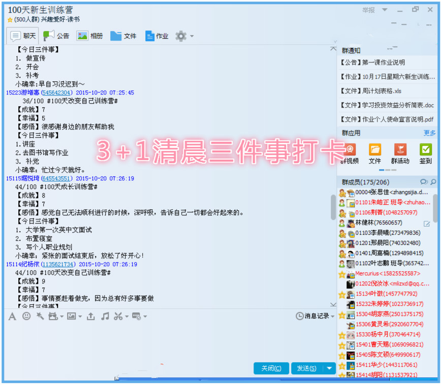 在新生入學時,學院就設置了專門的訓練營QQ群,入群新生統一編號,群內只能做一件事,那就是清晨三件事打卡活動。新生們每天早起后,做的第一件事就是在QQ群里打卡,列出自己當天要做的重要三件事以及一件小確幸,給自己昨天的成就感和幸福感打分,并寫下感悟與其他同學分享。到目前為止,大部分新生已經堅持打卡50多天,通過三件事的計劃和執行,新生們逐漸適應了大學生自主的學習方式,對大學生活更有掌控感。