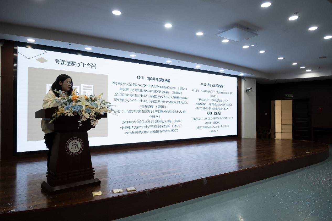 最后進行的是同學們期待已久的宣講環節。劉芷菁圍繞“如何從零開始搞科研”的主題,從競賽介紹、組隊要求和新生科研三個方面分享科研經驗。田婧茹以綠色社區建設和新能源應用為例,進行了關于“數據科學可以為民生做什么”的宣講。她指出學生應結合自身專業去解決問題,并鼓勵同學們以惠民利民為導向做科研、揚青春。她們用精彩的演講分享了數據科學的應用,引發現場學子熱烈反響。