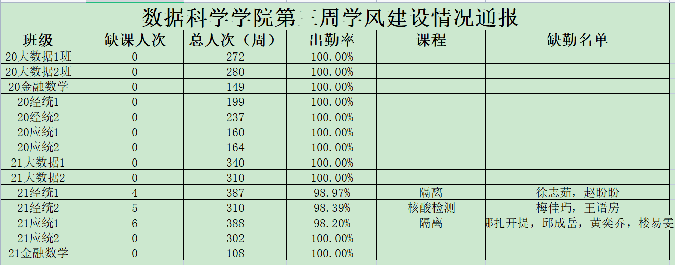 為進(jìn)一步培育優(yōu)良學(xué)風(fēng),構(gòu)建我院學(xué)風(fēng)建設(shè)的長(zhǎng)效機(jī)制,營(yíng)造良好的學(xué)習(xí)氛圍,推進(jìn)內(nèi)涵建設(shè),構(gòu)建優(yōu)良院風(fēng),學(xué)院對(duì)所有大一、大二班級(jí)統(tǒng)一上的課程及晚自習(xí)進(jìn)行了課前全覆蓋點(diǎn)名。現(xiàn)將點(diǎn)名情況做如下通報(bào)。