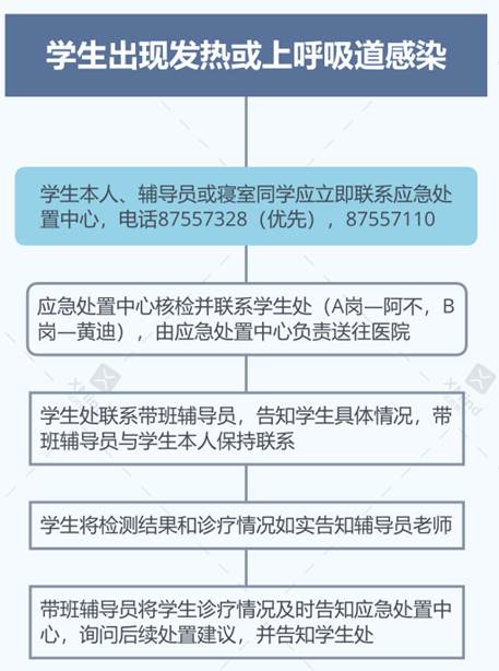 各位同學要持續時刻緊繃疫情防控這根弦,堅決克服麻痹思想、僥幸心理,慎終如始抓好常態化疫情防控,保障校園安全。如發現體溫異常或其他疑似感染癥狀(乏力、咳嗽、腹瀉等),要立即聯系學校應急處置中心并按照相關流程辦理,具體流程參看附件:學生出現發熱或上呼吸道感染處置流程圖。