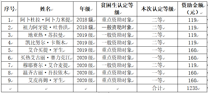 根據浙江省教育發展中心《關于做好2020-2021學年內地高校新疆籍學生資助對象工作的通知》文件精神,新葡萄8883官網AMG共收到劃撥經費為1235元。學院按照實事求是的原則,堅持公正、公平、公開,結合學院特色和學生實際情況,確定出資助名額共9個,其中一等4名,二等5名,具體情況見下表。